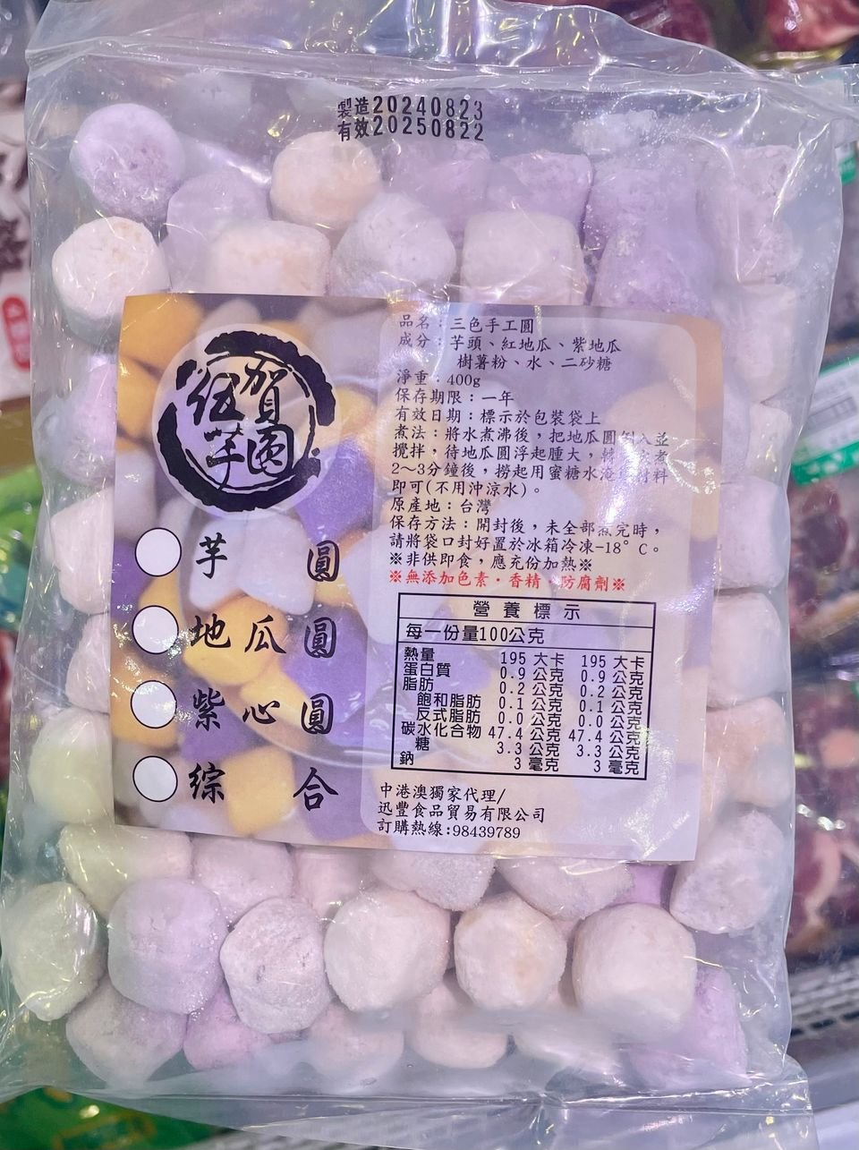 Do you love the denseness of taro, the sweetness of red sweet potato, or the bright color of purple sweet potato? This Taiwanese handmade three-color round will satisfy your desire for three flavors at once! Each one is purely handmade, using fresh Taiwanese taro, red sweet potato and purple sweet potato. No artificial coloring and spices are added during the production process to retain the most natural flavor.
